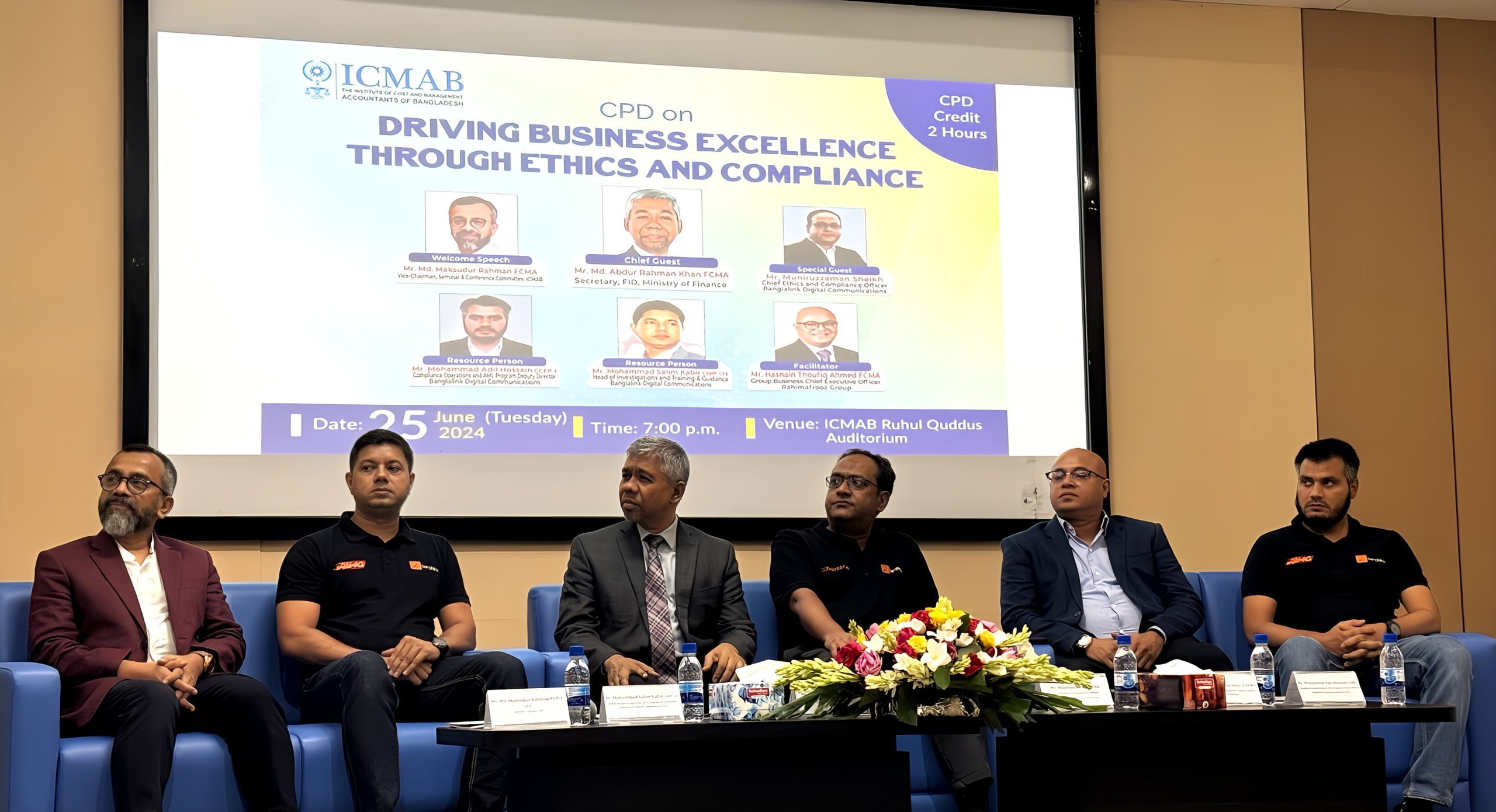 সেমিনারে প্রধান অতিথি হিসেবে উপস্থিত ছিলেন অর্থ মন্ত্রণালয়ের সেক্রেটারি অফ ফাইনানশিয়াল ইন্সটিটিউশন্স ডিভিশন (এফআইডি) ও কাউন্সিল মেম্বার অফ আইসিএমএবি, মোঃ আবদুর রহমান খান এফসিএমএ ও বিশেষ অতিথি হিসেবে ছিলেন বাংলালিংক-এর চিফ এথিকস এন্ড কমপ্লায়েন্স অফিসার, মুনিরুজ্জামান শেখ। নলেজ শেয়ারিং সেশনটিতে সমন্বয়কারীর ভূমিকা পালন করেন কাউন্সিল মেম্বার অফ আইসিএমএবি ও গ্রুপ বিজনেস চিফ এক্সিকিউটিভ অফিসার (সিইও), রহিমআফরোজ গ্রুপ, হাসনাইন তৌফিক আহমেদ, এফসিএমএ।